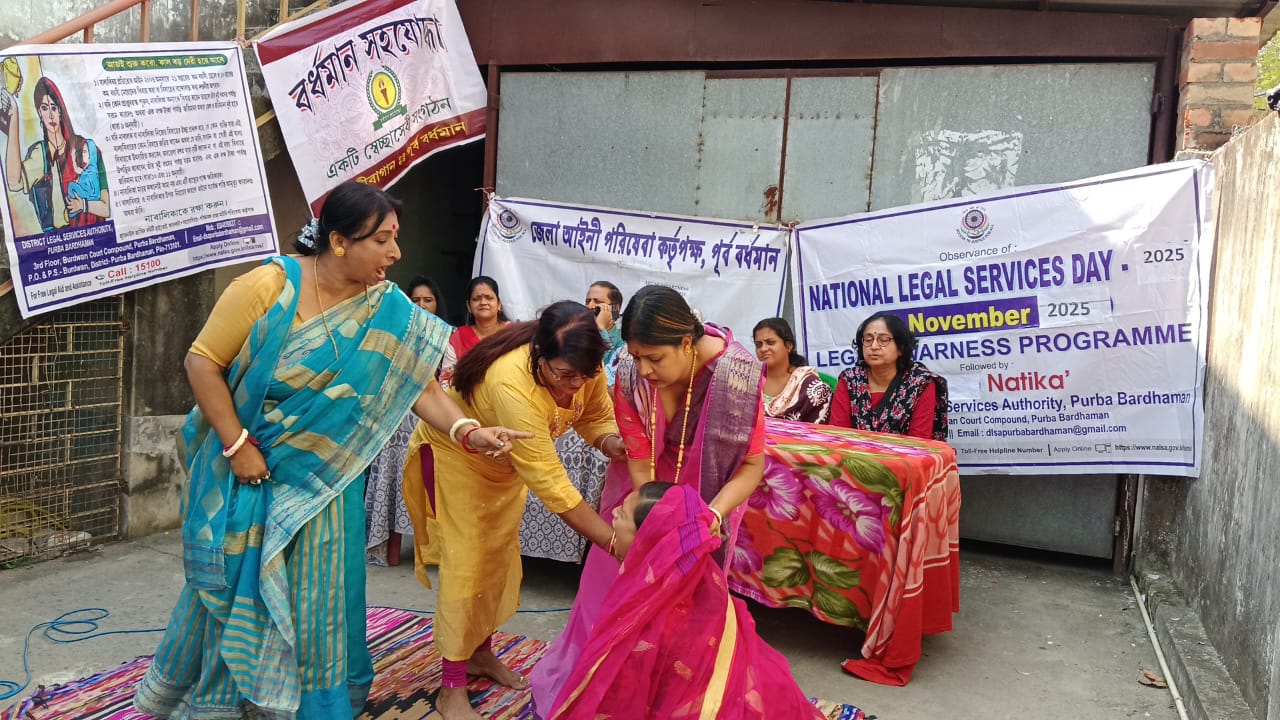 ওইদিন বিভিন্ন রকম সামাজিক সচেতনতার মাধ্যমে ৯ই নভেম্বর ২০২৫ রবিবার “জাতীয় আইনি পরিষেবা দিবস” পালিত হলো। । অনুষ্ঠানে বর্ধমান জজকোর্ট থেকে টাউন হল পর্যন্ত একটি শোভাযাত্রা অনুষ্ঠিত হয় পাশাপাশি বর্ধমান কার্জন গেটে ” নারী পাচার” বিষয়ক একটি পথনাটিকার মাধ্যমে পথ চলতি সাধারণ মানুষদের সচেতন করা হয়। এছাড়াও সিএমএস স্কুল মাঠে “নাবালিকার বিয়ে” নামক একটি নাটকের মাধ্যমে বাল্যবিবাহের খারাপ দিকগুলি তুলে ধরা হয়। এই নাটকে বিশেষভাবে যে দিকটা তুলে ধরা হয় প্রতিবেশীর কথায় একটি নাবালিকা মেয়েকে তার পরিবার কিভাবে বিয়ে দেওয়ার পর নাবালিকা দিনের পর দিন অত্যাচারিত হয় এবং সবশেষে নাবালিকাকে অত্যাচারের ফলে সে মারা যায়, এবং সর্বোপরি এটাই বার্তা দেওয়া হয়েছে যে কম বয়সের বিয়ে এটি অপুষ্টি জনিত শিশুর জন্ম দিতে পারে তাই কম বয়সে বিয়ে সমাজের একটি ব্যাধির আকার ধারণ করে।।
