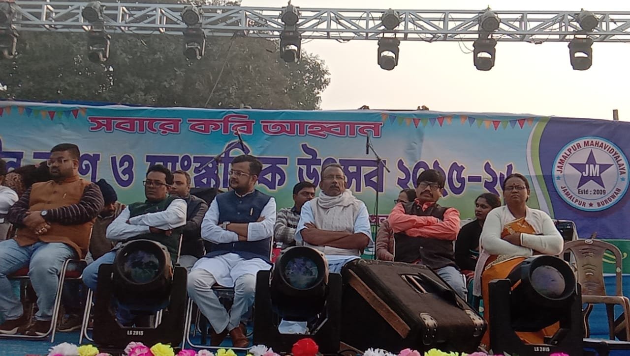 সেখ সামসুদ্দিন, ২০ ডিসেম্বরঃ পূর্ব বর্ধমানের জামালপুর মহাবিদ্যালয়ে সাড়ম্বরে পালিত হল নবীন বরণ ও বার্ষিক সাংস্কৃতিক অনুষ্ঠান। এই অনুষ্ঠানে অতিথি হিসাবে উপস্থিত ছিলেন বিধায়ক অলক কুমার মাঝি, রাজ্য তৃণমূল কংগ্রেস ছাত্র পরিষদের সহ সভাপতি তথা তৃণমূলের রাজ্য মুখপত্র কোহিনুর মজুমদার, জেলা তৃণমূল ছাত্র পরিষদের সভাপতি স্বরাজ ঘোষ, কলেজ পরিচালন সমিতির সভাপতি তথা পঞ্চায়েত সমিতির সহ সভাপতি ভূতনাথ মালিক, প্রাক্তন সভাপতি তথা তৃণমূলের ব্লক সভাপতি ও পঞ্চায়েত সমিতির পূর্ত কর্মাধক্ষ্য মেহেমুদ খাঁন,পঞ্চায়েত সমিতির সভাপতি পূর্ণিমা মালিক, কলেজ পরিচালন সমিতির সদস্য অতনু হাজরা, জেলা পরিষদের সদস্য শোভা দে, পঞ্চায়েত সমিতির বিদ্যুৎ কর্মাধ্যক্ষ শিপ্রা ওঝা, কলেজের অধ্যাপক ও অধ্যাপিকা সহ বিশিষ্ট ব্যক্তিবর্গ। প্রদীপ প্রজ্জ্বলন করে অনুষ্ঠানের শুভ সূচনা করেন উপস্থিত অতিথিবৃন্দ। স্বাগত ভাষণ দেন অধ্যাপিকা ডঃ অমৃতা দাম। প্রথম পর্বে প্রথম সেমিস্টারের ছাত্রছাত্রীদের বরণ করে নেওয়া হয়। আজকের বার্ষিক সাংস্কৃতিক অনুষ্ঠানে শিল্পী হিসাবে উপস্থিত হয়েছিলেন জি বাংলা খ্যাত গায়িকা অনিন্দিতা চন্দ, গায়ক পাপ্পু সিং। গানে বাজনায় তালে আজকের অনুষ্ঠান যথেষ্ট উপভোগ করে ছাত্রছাত্রীরা। অনুষ্ঠানটি সফল ভাবে সম্পন্ন করতে যাঁরা দিনরাত এক করে খেটেছে তারা হলো ছাত্র পরিষদের ব্লক সভাপতি বিট্টু মল্লিক ও তাঁর সঙ্গে অনিশ, সাইফুদ্দিন, রাম, সুমন সহ তাঁর ফুল টিম। অনুষ্ঠানটি সুন্দর ভাবে সঞ্চালনা করেন বিশিষ্ট বাচিক শিল্পী সুদীপা সরকার।